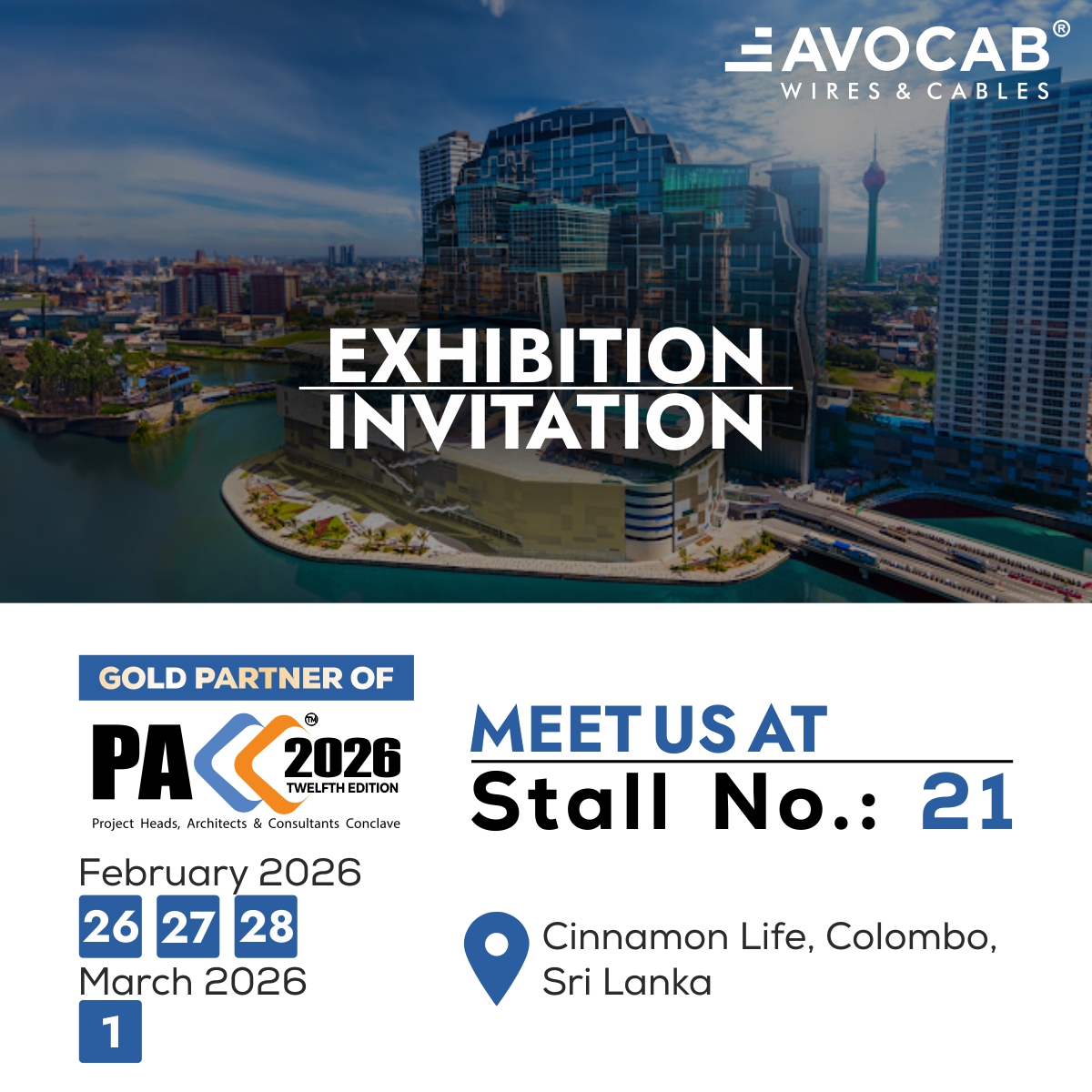 AVOCAB, a Gold Partner in PACC 2025, will host a conclave in Chennai from February 6th to 9th, 2025, featuring Smart City CEOs, government officials, architects, builders, service consultants, and end users for Tech Talks, technology evolutions, best practices, implementation, and market challenges.